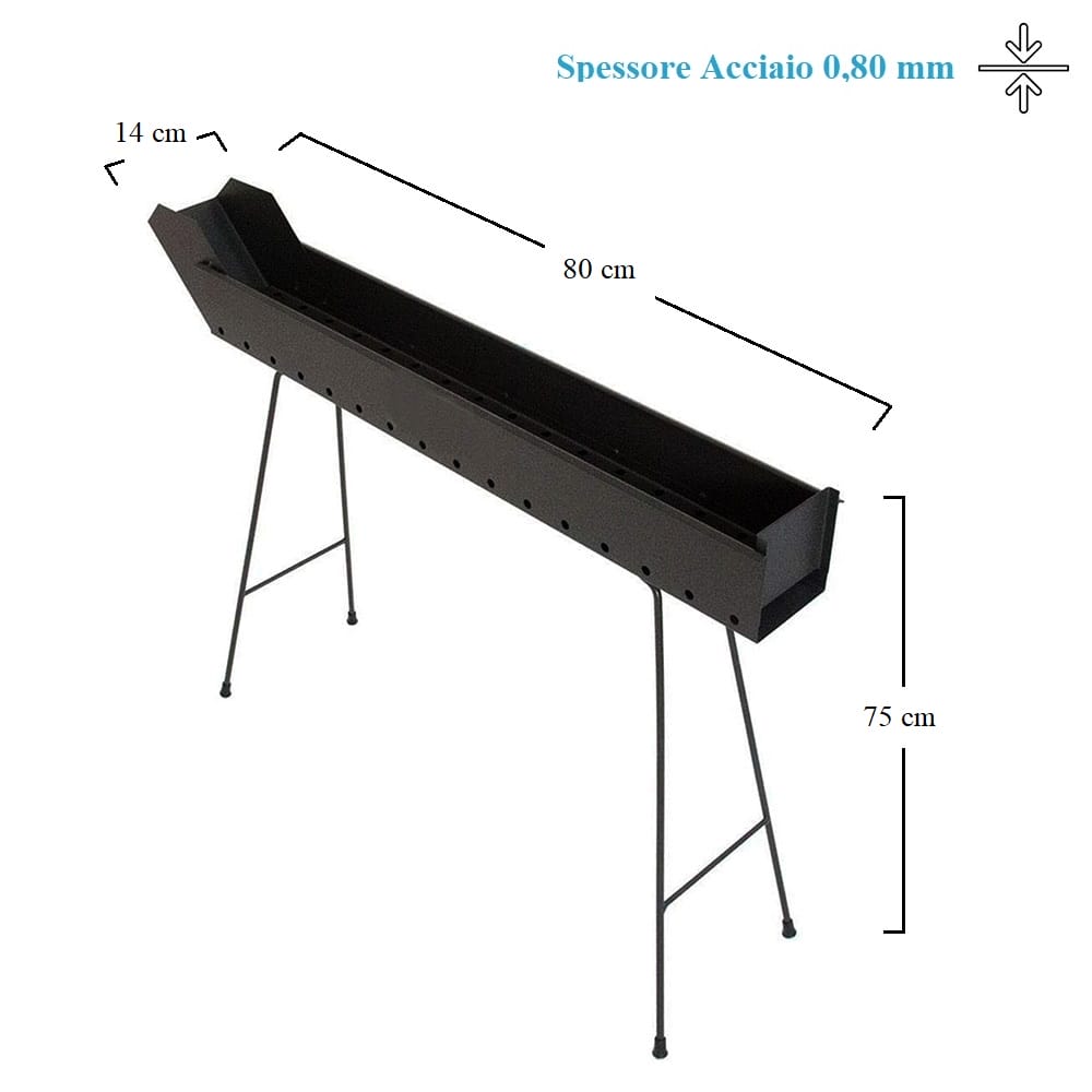 Cuocispiedini a carbonella da esterno, progettato per cuocere spiedini ma soprattutto i tipici arrosticini abruzzesi, ideale per le tue grigliate all'aperto. Ideato per cuocere gli arrosticini ad alte temperature (permette di cuocere gli arrosticini vicini alla brace). Il barbecue a canaletta è disponibile in diverse misure:- 80x14x75 cm;