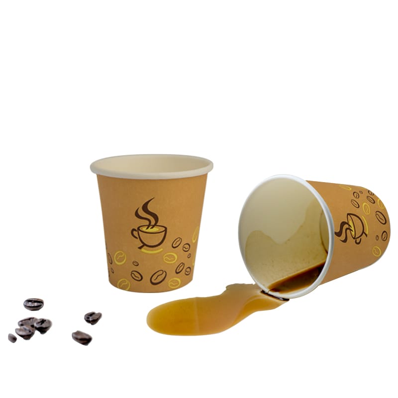 I bicchieri da 75ml in carta, di colore Avana con Grafica Chicco di Caffè monouso, sono realizzati in cartoncino di pura cellulosa di altissima qualità accoppiato a caldo con un sottile film in PLA, adatti per bevande calde ma anche fredde.