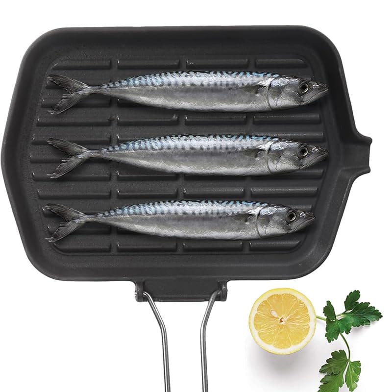 Bistecchiera rettangolare in ghisa smaltata - Misura 23x36cm - Piastra nera a induzione con manico pieghevole e grill antiaderente