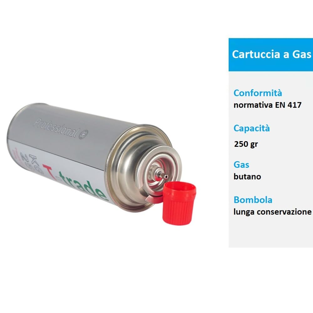 - TOP QUALITY - la cartuccia da 250 gr contiene una miscela di gas butano, ideale per fornire un’energia pulita e ad alta efficienza per i tuoi dispositivi da campeggio. Grazie alla conformità con la normativa EN417, la cartuccia garantisce elevati standard di sicurezza e prestazioni, assicurandoti un utilizzo senza preoccupazioni. È perfetta per fornelli, saldatori e altri apparecchi da campeggio che richiedono un’alimentazione affidabile e sicura.