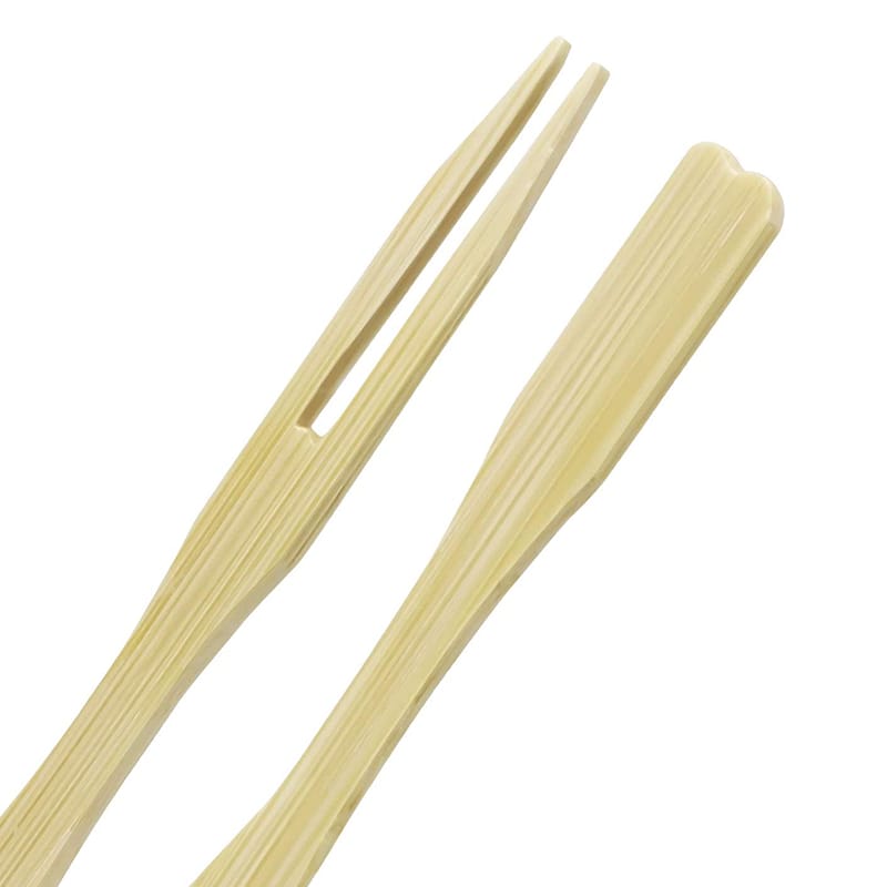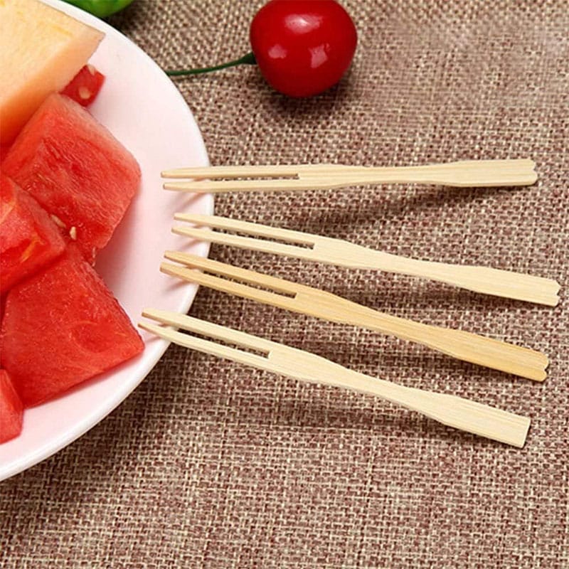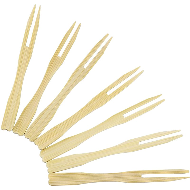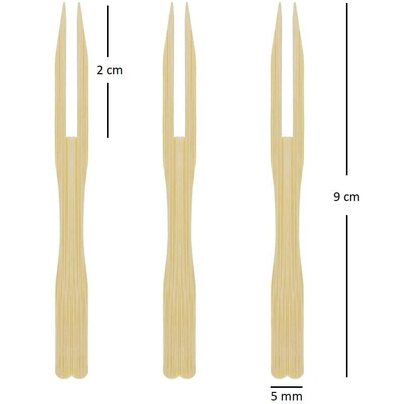 Forchettine di legno a 2 Punte con lunghezza pari a 9 cm. Forchette a due rebbi biodegradabili e compostabili imbustate in confezioni da 100 pezzi, dal design semplice e originale ideali per un uso sia professionale che casalingo per sostituire le classiche forchettine.
