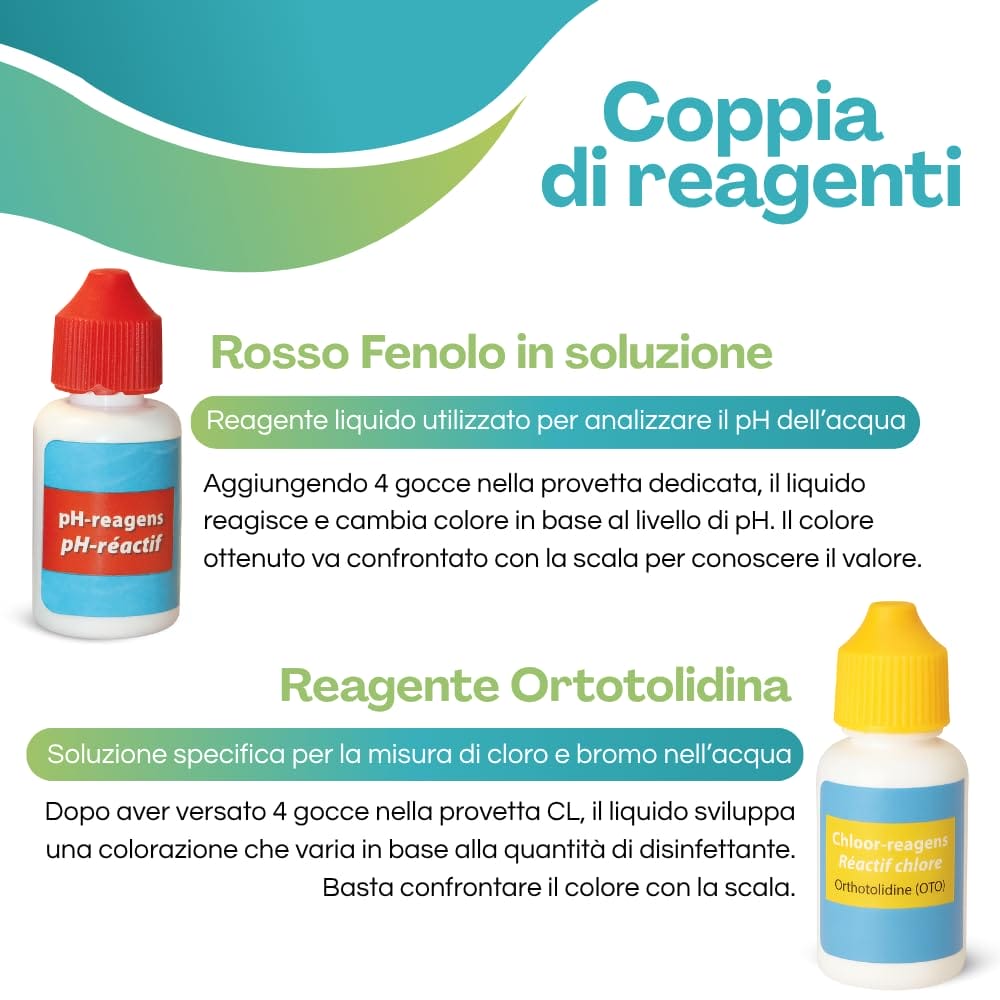 Kit per Test analisi Cloro, pH e Bromo per acqua piscina, spa e acque termali - Scatola tester a gocce analizzatore e controllo della qualità dell'acqua