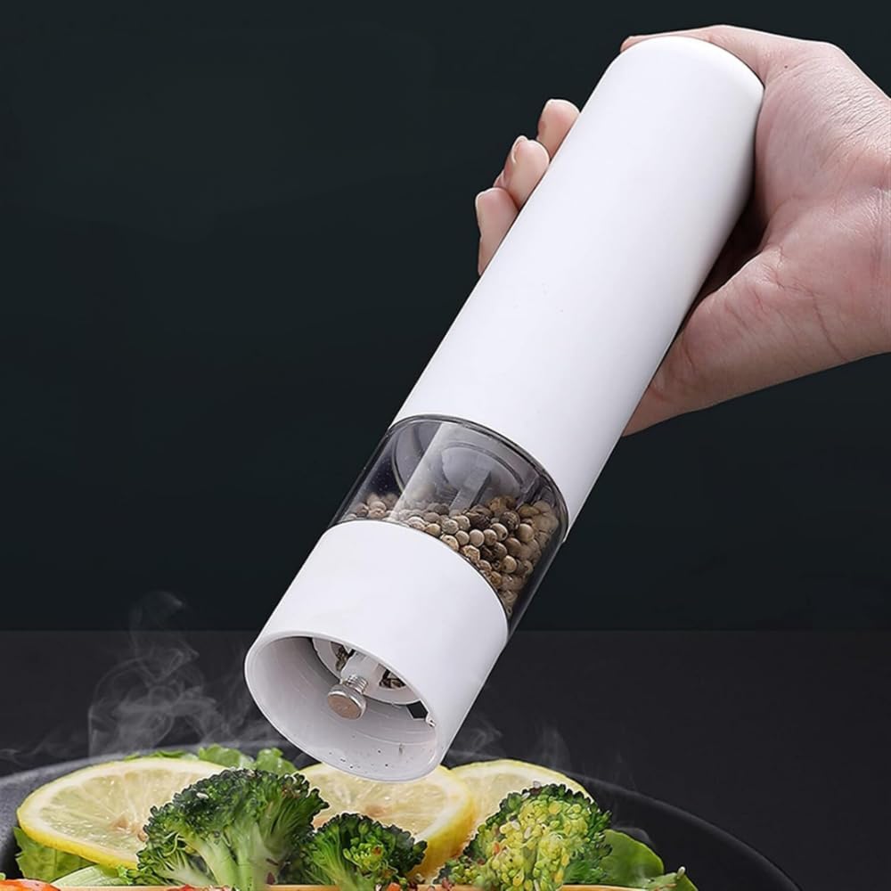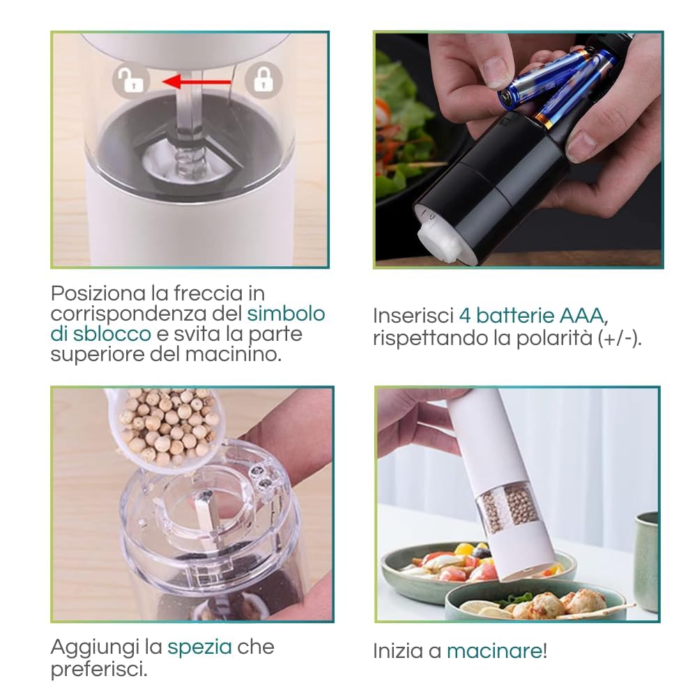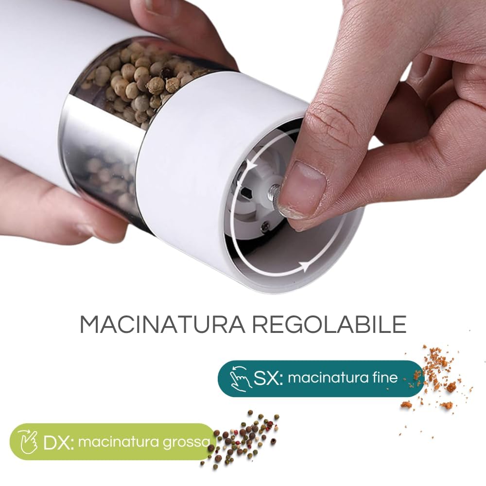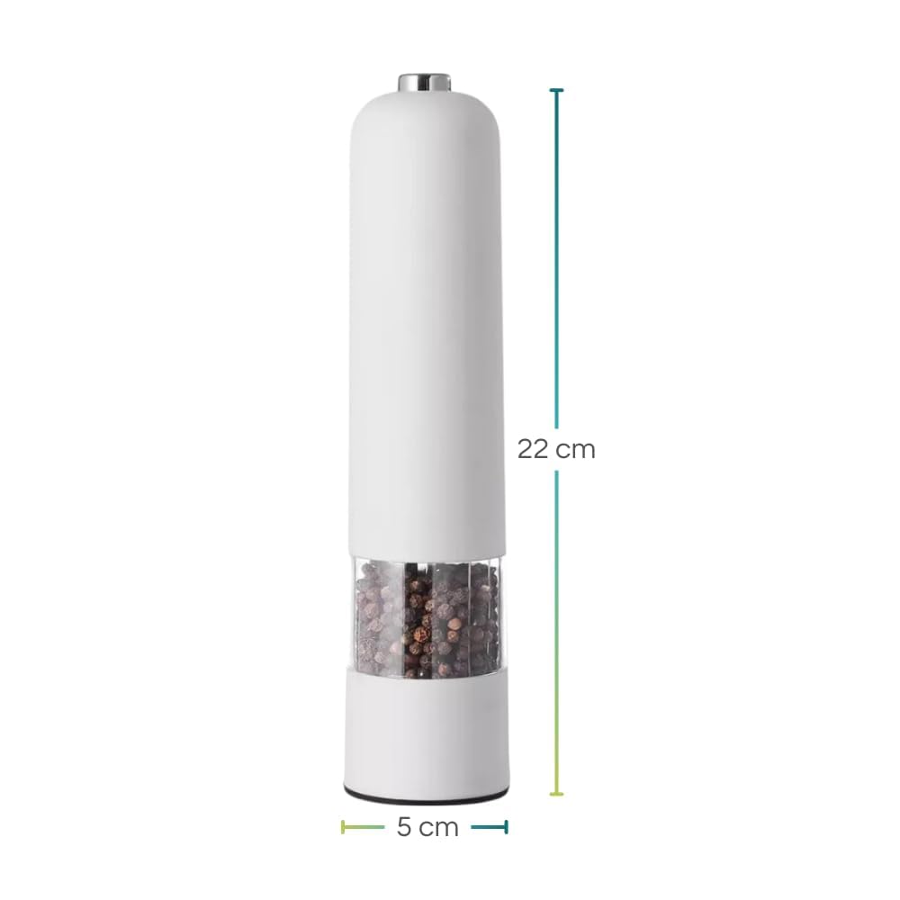 Il Macina sale e pepe elettrico a batteria è un accessorio essenziale per ogni cucina moderna. Con un design elegante e una struttura alta 22 cm, questo macinino offre praticità e stile al tuo spazio culinario. Dotato di una rotella di regolazione, consente di scegliere la finezza desiderata per il sale, il pepe o altre spezie. Un semplice pulsante di accensione rende l'utilizzo facile e intuitivo, permettendo un controllo senza sforzo durante la preparazione dei tuoi piatti preferiti.