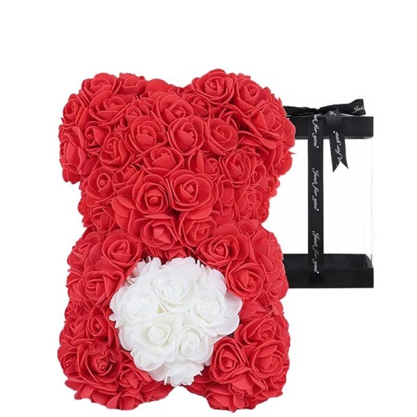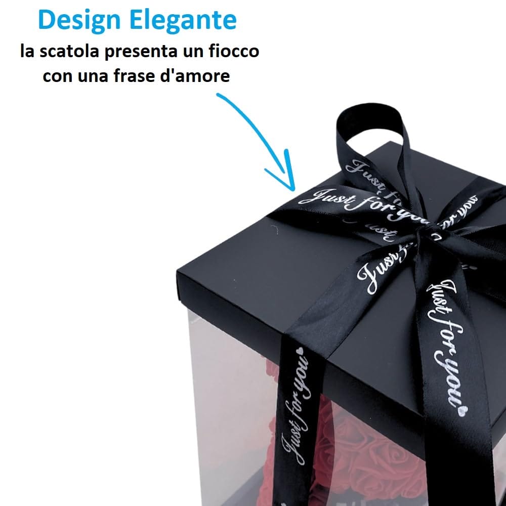 L'orso, con una misura pari a 17x17x25 cm, è perfetto da esporre su una mensola o un comodino, aggiungendo un tocco di eleganza a qualsiasi ambiente. Viene fornito con una scatola regalo trasparente da montare, rendendolo pronto per essere regalato senza bisogno di ulteriori confezionamenti. La scatola non solo protegge il tuo dono, ma ne esalta anche la bellezza, permettendo di ammirare ogni dettaglio delle rose.