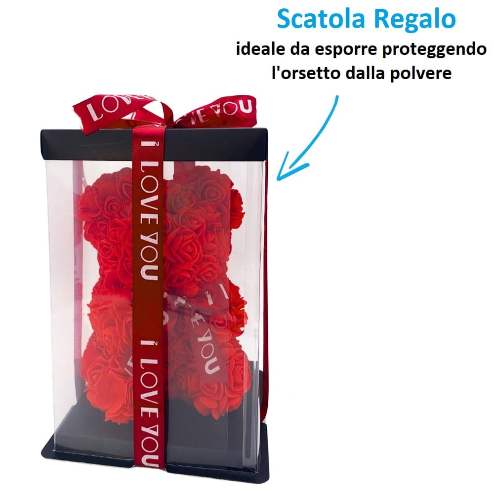 Orsetto di Rose Rosse Artificiali con LED con scatola Regalo Trasparente - mis. 16x17x20 cm - Idea Romantica per San Valentino, Anniversari e Compleanni