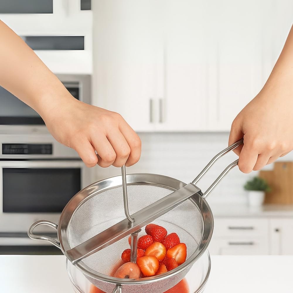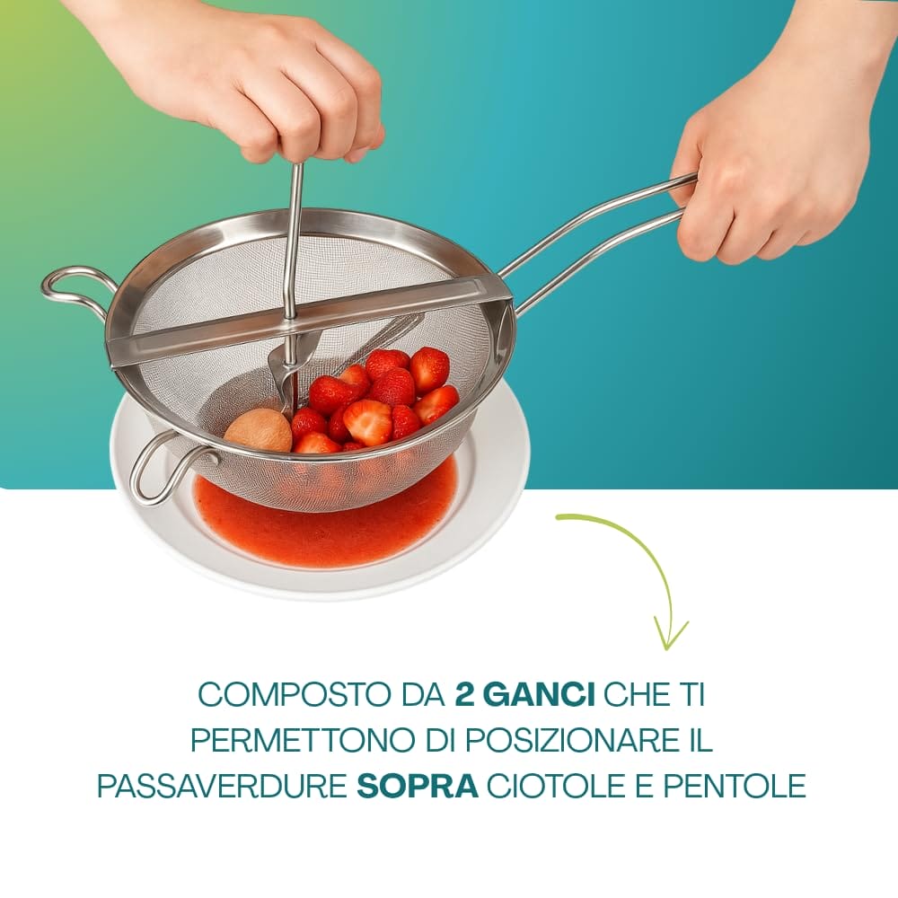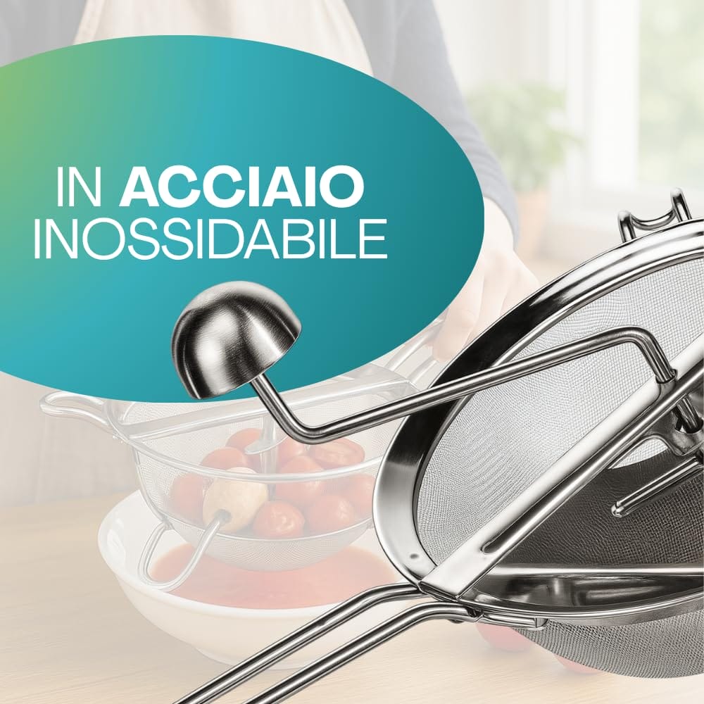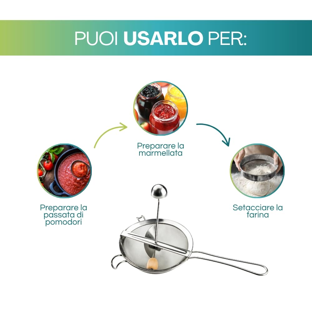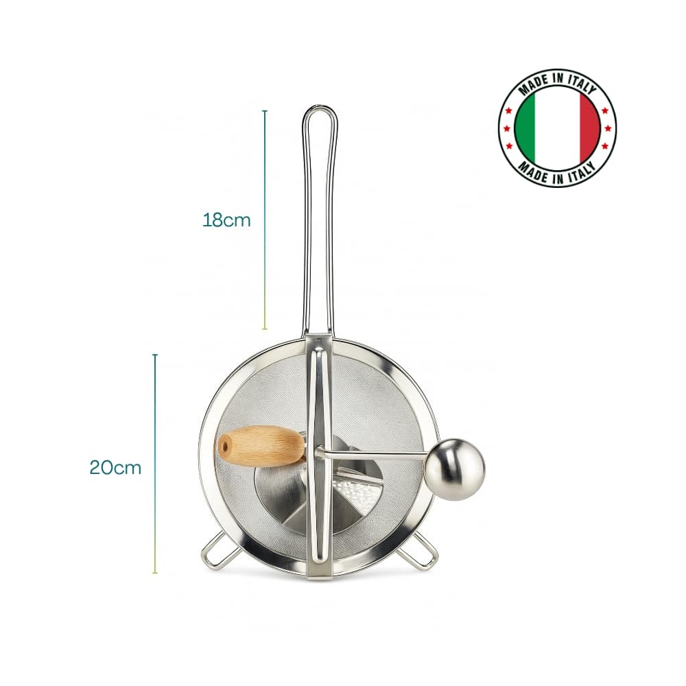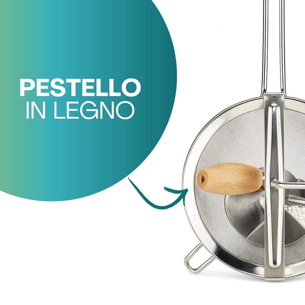 Passacolino manuale in Acciaio inox 18/10 - Diametro 20 cm - Passaverdura con pestello in legno per schiacciare Patate, Verdure o setacciare la farina