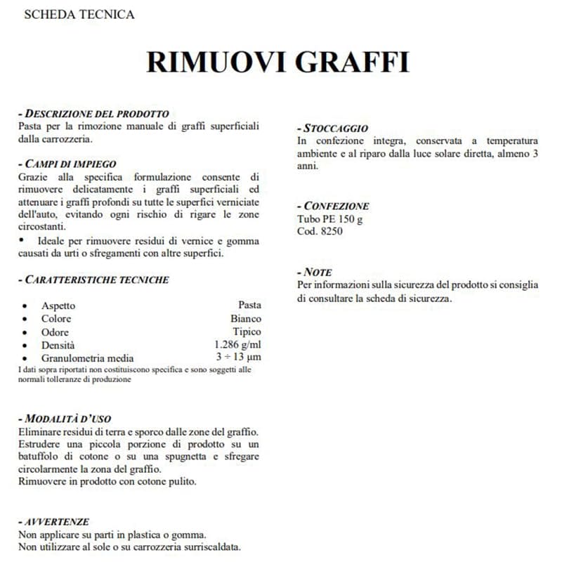 Tubetto di Rimuovi Graffi da 150gr, ideale per la rimozione manuale di graffi superficiali dalla carrozzeria della tua auto o moto in seguito a piccoli urti o sfregamenti. Ideale per la rimozione dei residui di vernice e gomma causati da urti e sfregamenti con altre superfici.