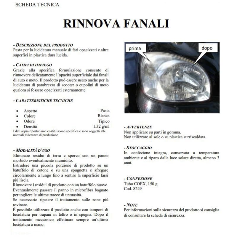 Rinnova Fanali da 150gr, ideale per la lucidatura di fari opacizzato. Il prodotto è studiato appositamente per ripristinare la trasparenza di fanali ai primi stadi di opacizzazione. La pasta è ideale anche per la lucidatura manuale di altre superfici in plastica dura lucida.