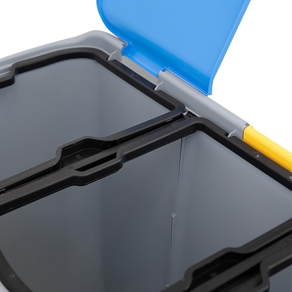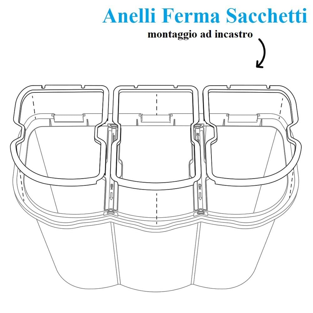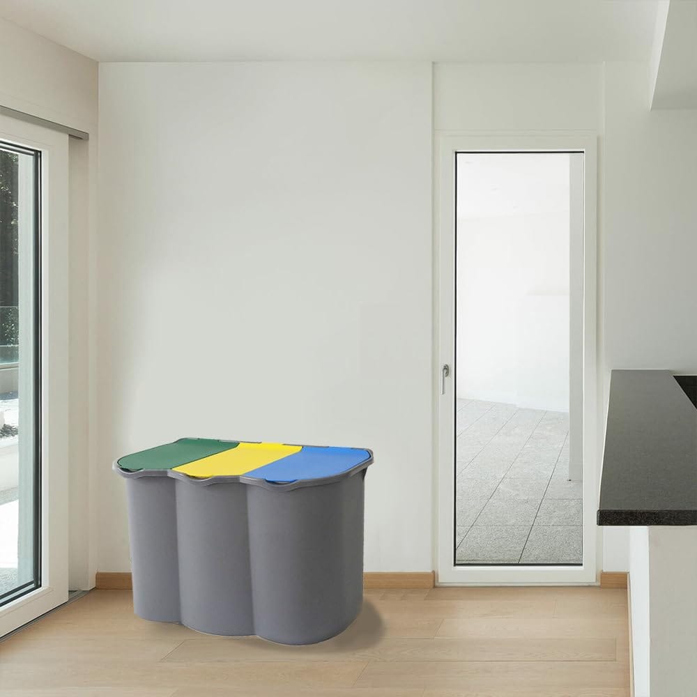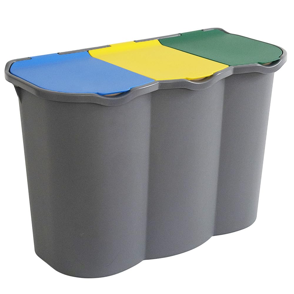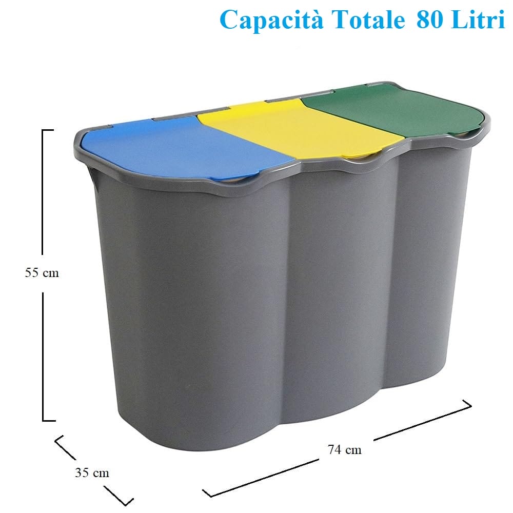 Pattumiera per la raccolta differenziata 3 scomparti - Capacità 80 litri e misura 74x35x55 cm - Anelli ferma sacchetto, secchio per spazzatura con coperchi azzurro, giallo e verde