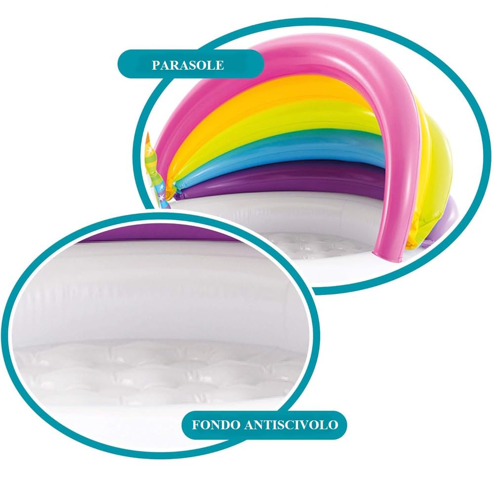Piscina gonfiabile con misura 127x102x69 cm a forma di Unicorno - Piscinetta per bambini in Pvc con parasole arcobaleno