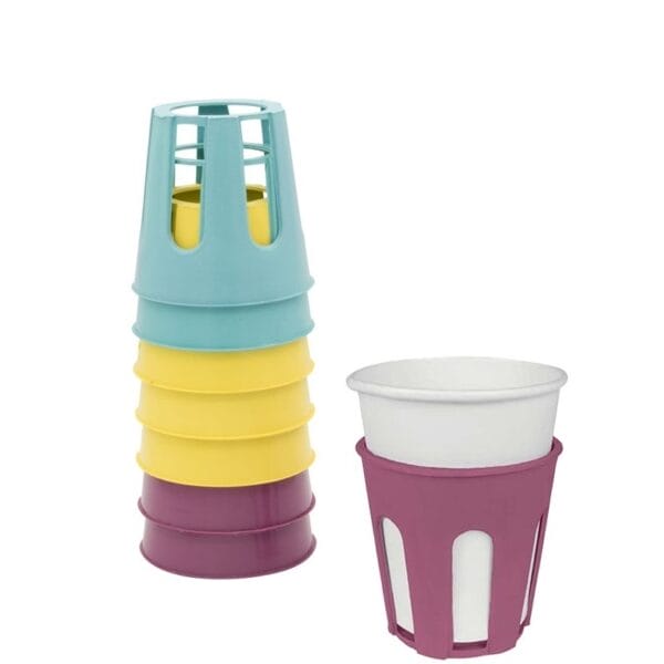 plastica molto resistente; la confezione contiene 8 porta bicchieri di colorazioni differenti. Adatti per bicchieri monouso in plastica e in cartone.