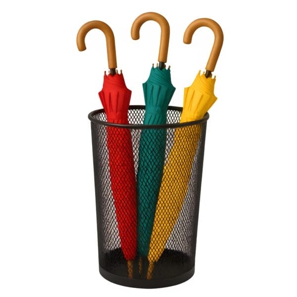 Cesto portaombrelli a rete in metallo di colore Nero, con dimensioni pari 26,5x26,5x51 cm, ideale per contenere i tuoi ombrelli bagnati all'ingresso della tua abitazione o del tuo ufficio. Non dovrai più preoccuparti di bagnare il pavimento della tua casa durante le giornate di pioggia.