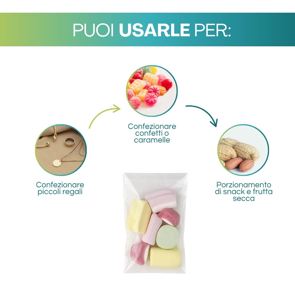 Le buste cellophane trasparenti con alette adesive sono bustine prodotte in Italia ideali per confezionamento di regali, bomboniere, indumenti, confetti, caramelle, marshmallow, ecc. I sacchetti di cellophane sono idonei al contatto alimentare perché costituti da plastica non tossica che non mette a rischio la tua salute o quella dei tuoi clienti.
