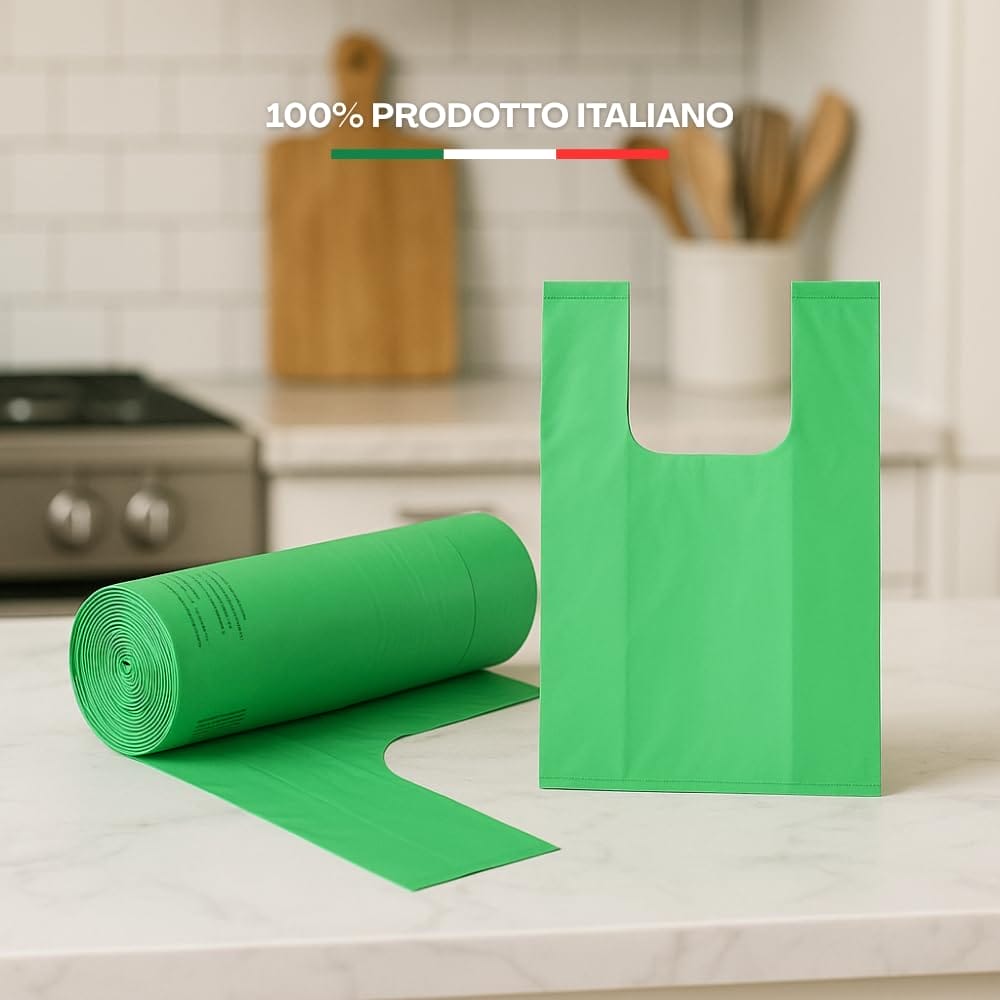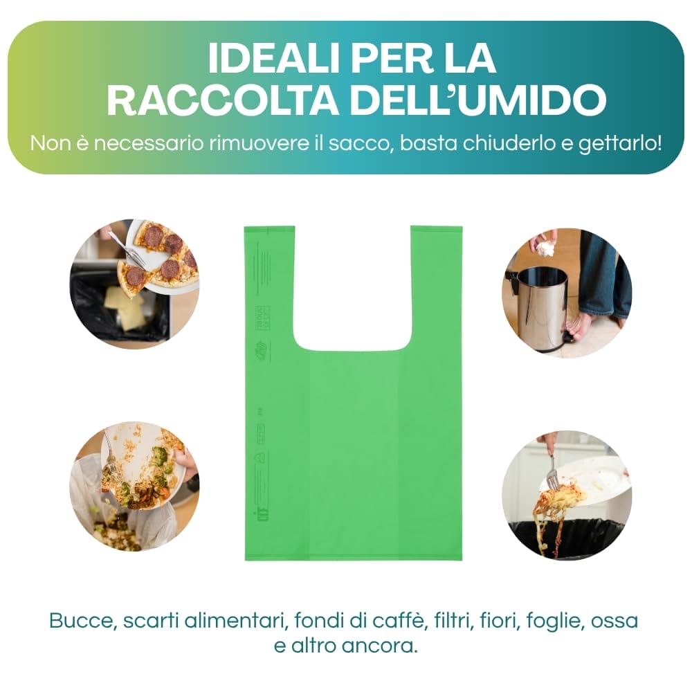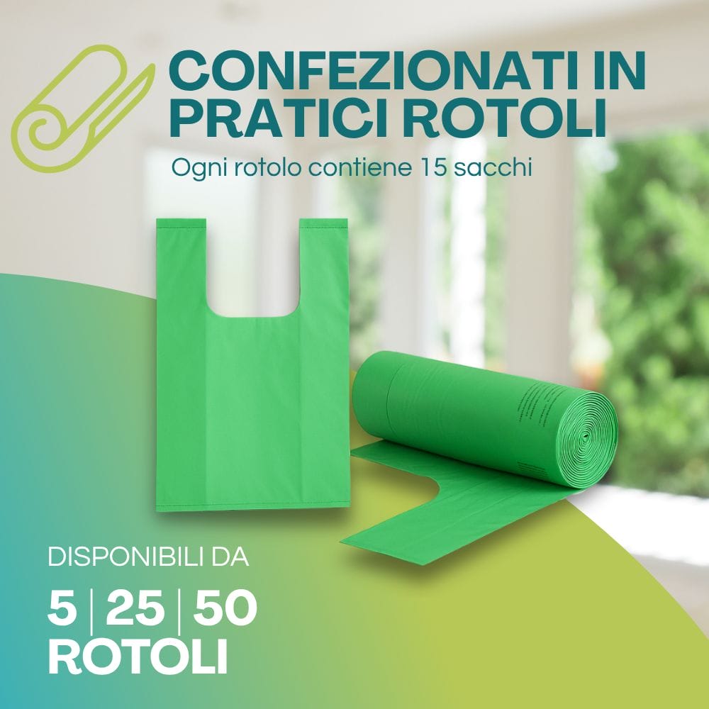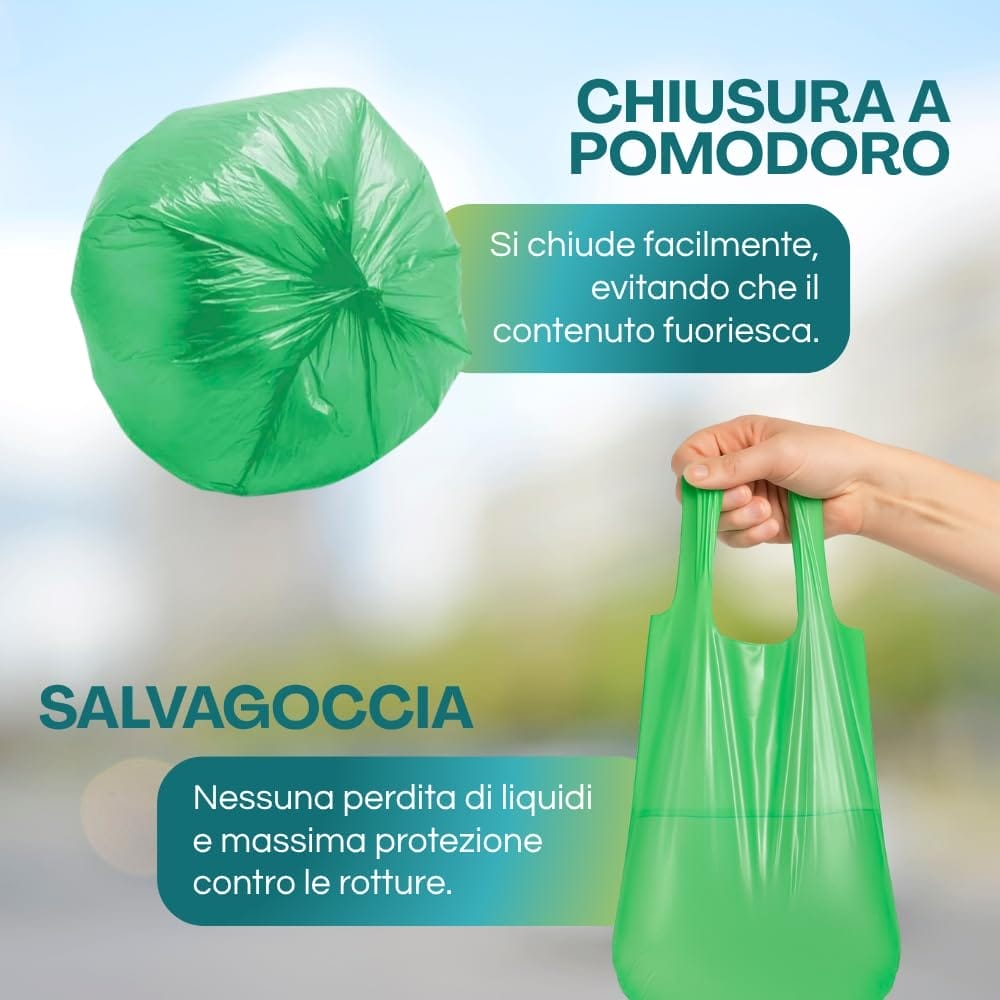I nostri sacchi per organici con maniglia rappresentano una soluzione di altissima qualità; infatti sono costituiti da materiali molto resistenti ed in più Biodegradabili e Compostabili. A differenza dei tanti presenti sul mercato, questi sacchi una volta pieni, non permettono la fuoriuscita di liquidi ne tanto meno l'assottigliamento di essi così da trasportarli senza spiacevoli rotture accidentali.