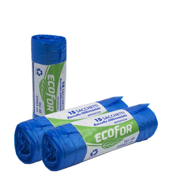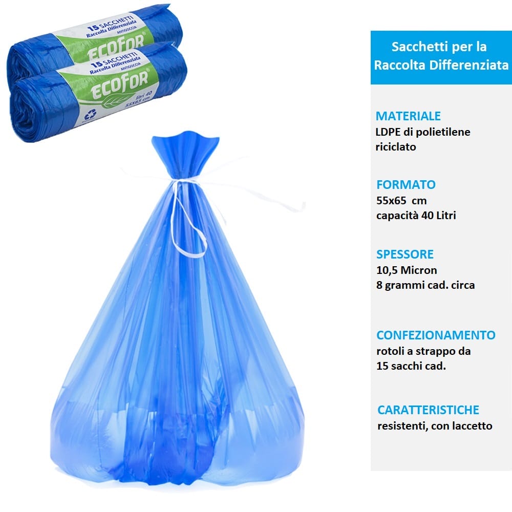 - 10 rotoli da 15 buste per un totale di 150 sacchi per la raccolta differenziata di colore blu o giallo;