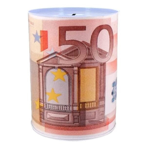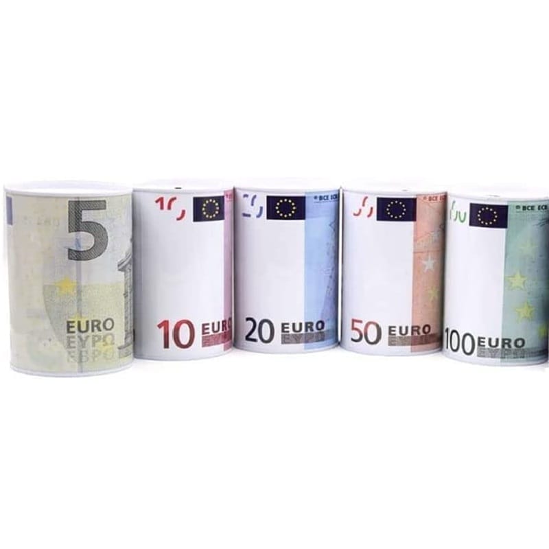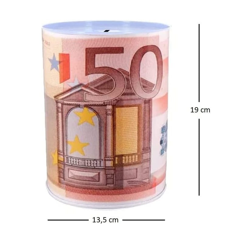 Salvadanaio Grande Vintage di forma cilindrica 13,5x19 cm Banconota Euro - Barattolo in latta portamonete non apribile - 50 Euro