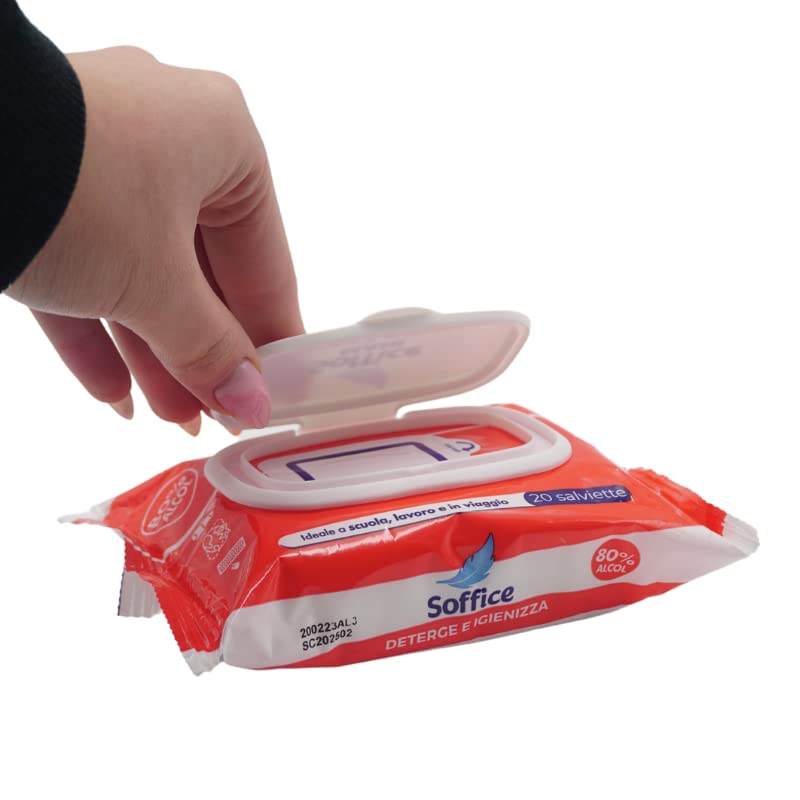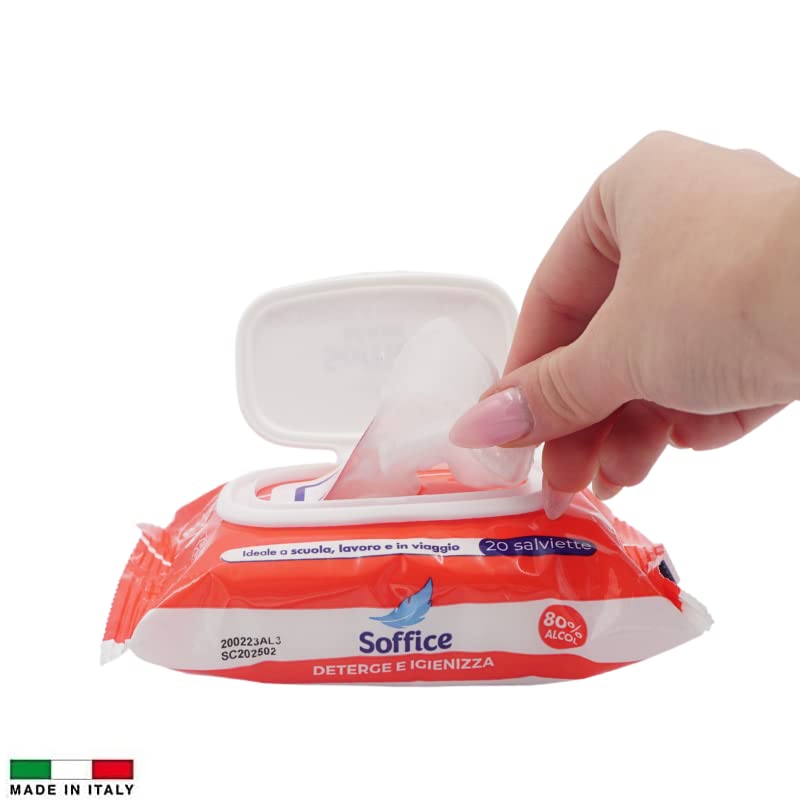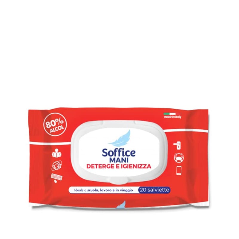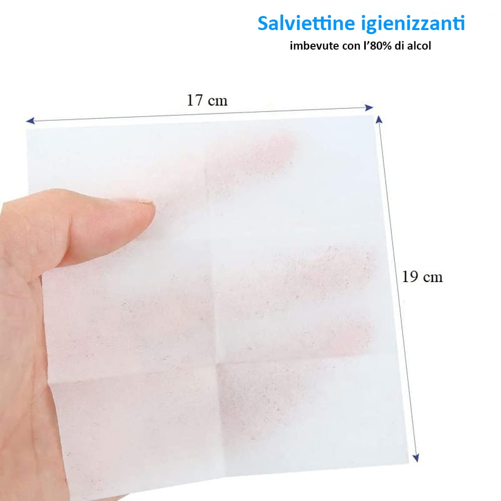 Salviettine igienizzanti e detergenti, confezioni da 20 salviette imbevute, perfette per detergere ed igienizzare rapidamente le mani o le superfici combattendo ed eliminando germi e batteri.