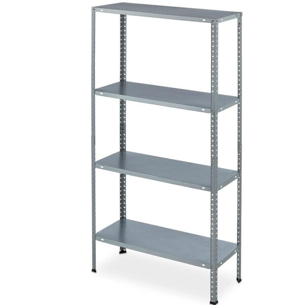Scaffale in metallo 4 ripiani con dimensioni 75x30x147 cm e portata di 45 kg per ogni ripiano per un totale di carico di 180 kg. Questo scaffale offre una solida struttura che supporta in modo sicuro una varietà di oggetti pesanti, garantendo stabilità e affidabilità nel tempo.
