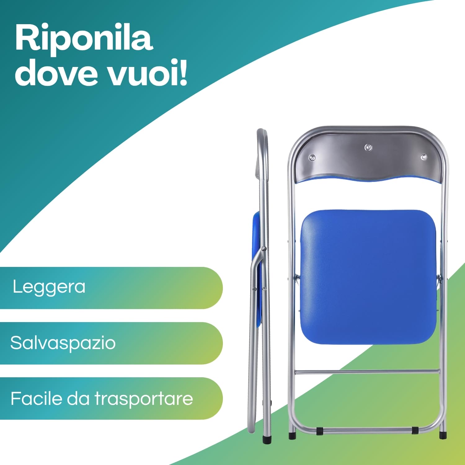 Sedia pieghevole imbottita di colore Blu, con misura aperta pari a 44x48x78 cm e seduta pari a 40x38 cm, ideale pe qualsiasi tipo di evento o semplicemente da utilizzare come sedie ausiliari quando si hanno ospiti a casa.