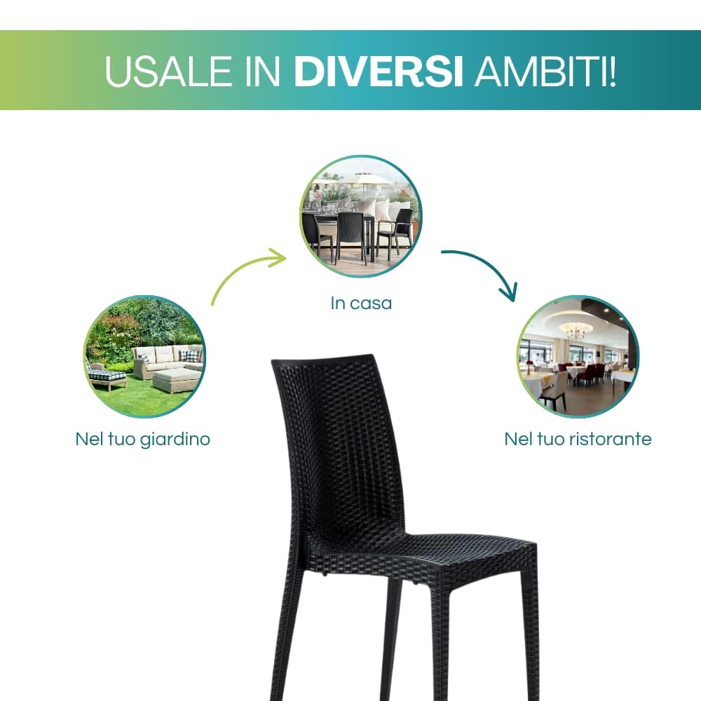 Sedia effetto rattan in polipropilene di colore Antracite, misura pari a 39x46x81 cm, ideali per qualsiasi tipo di evento sia all’interno che all’esterno o semplicemente da utilizzare come sedie ausiliari quando si hanno ospiti a casa. Made in Italy
