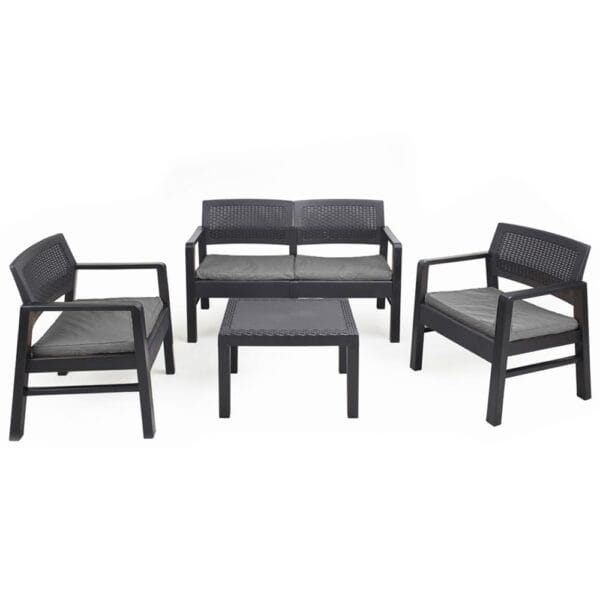 Set Salotto da esterno per 4 Posti in Polipropilene con Divano a 2 Posti, 2 Poltrone e Tavolino – Salotto da giardino completo di Cuscini - Colore Antracite