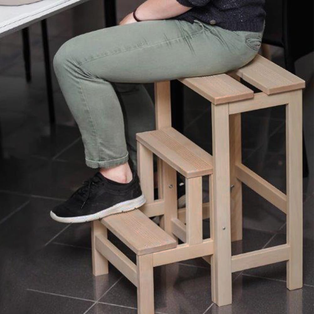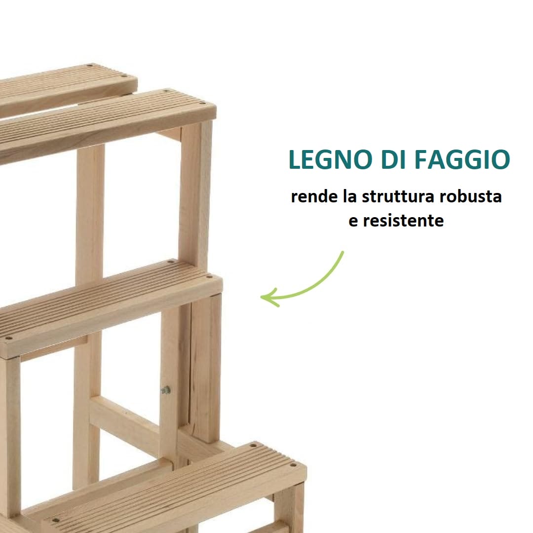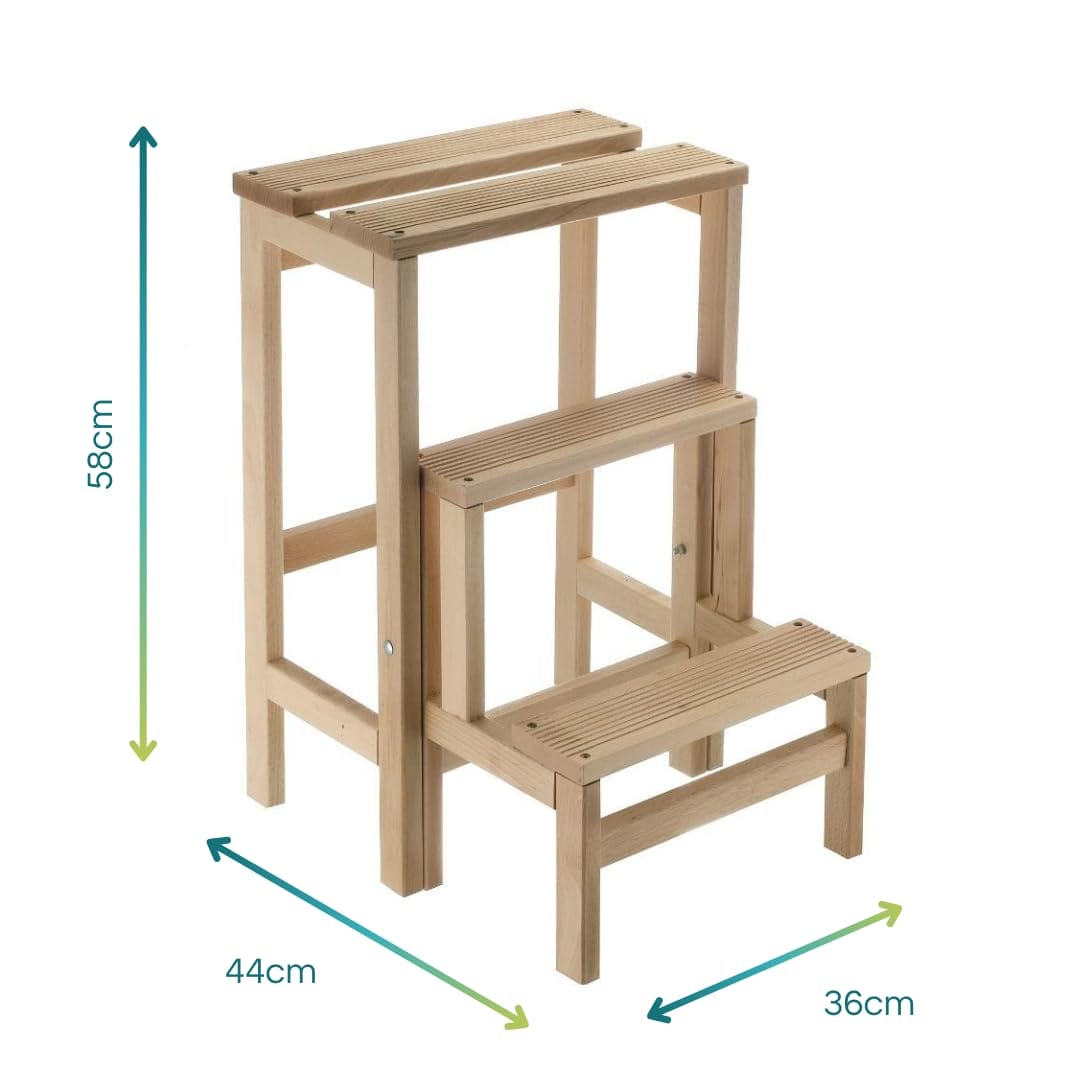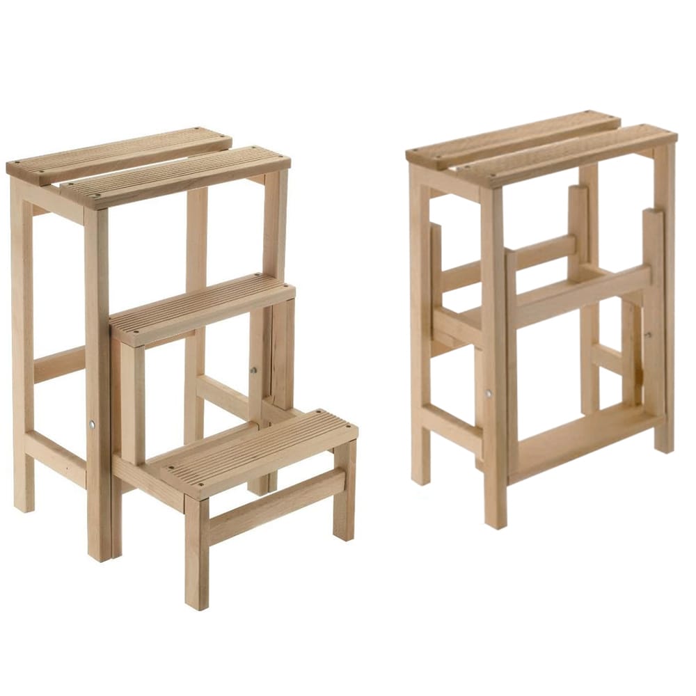 Scala sgabello con Ribalta a 3 Gradini in Legno di Faggio - Sgabello pieghevole Salvaspazio con Gradini Antiscivolo - Misura 36x44x58 cm
