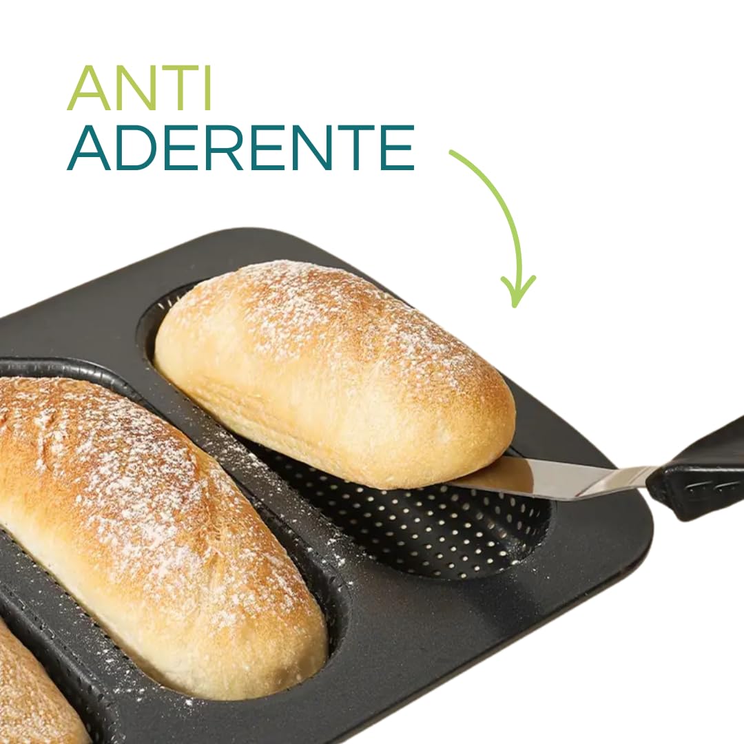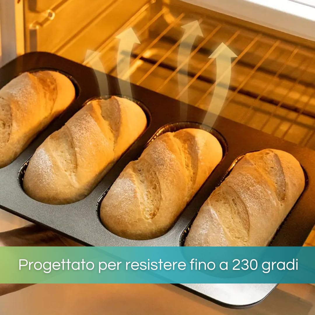 Teglia da forno antiaderente per panini e baguette in acciaio al carbonio - Misura 34,6x21,5 cm - 4 Stampi forati da 7x17 cm - Resistente fino a 230°