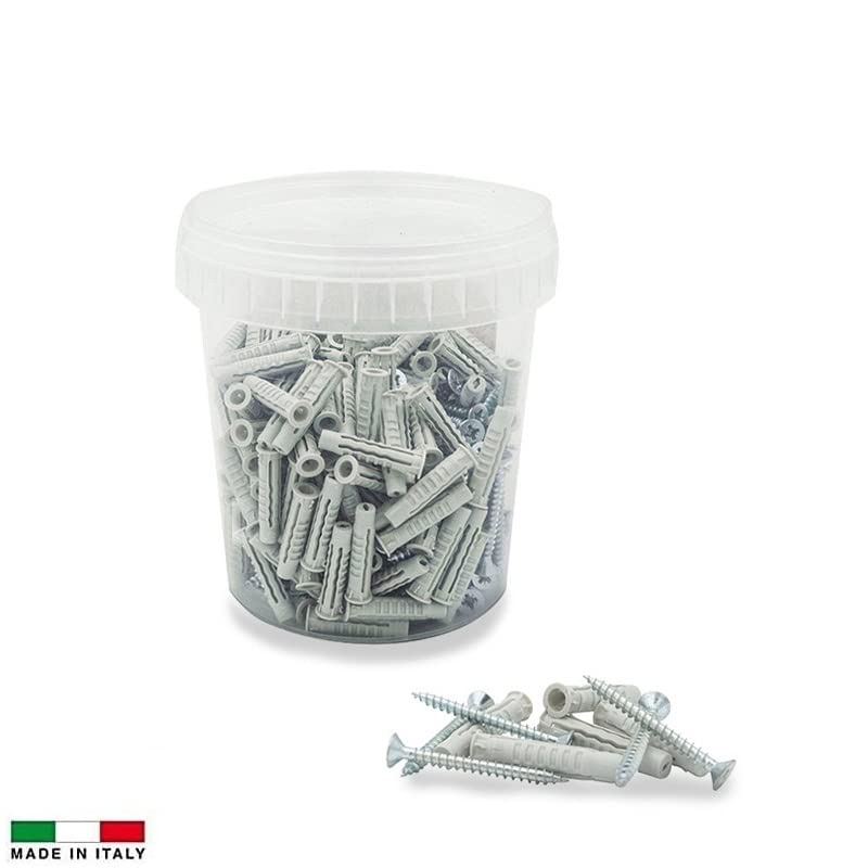 Viti e tasselli per muro Secchiello con 50 Tasselli a muro in Nylon e 50 viti in acciaio, mis. 10x50 mm - Tasselli universali ad espansione per fissaggio su muratura e cemento